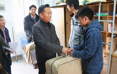 下午1时30分刚过,校党委副书记唐和祥就已来到河西校区11幢学生公寓的青藤书院。这里住着两位来自贵州的家庭困难学生,其中一位是法学院杨同学,一家三口仅靠父亲一个人微薄的收入支撑,爷爷又常年多病,光是看病吃药就需要很大一笔开销,属于特困家庭。类似的情况在成章书院的王同学与曹同学身上也存在。“困难是暂时的,你们一定要相信学校,相信大家,也相信你们自己,我们一起努力,一定能克服。”在了解了同学们的困境后,唐副书记给同学们打了面对挫折的“强心剂”,鼓励他们要好好珍惜学习机会,立志成材。同时他代表学校给同学们分别送上大棉被御寒。“谢谢学校领导的关心,我很高兴,觉得心里很温暖,我一定会好好努力的。”来自陕西、就读于机电学院的小王同学感动地说。