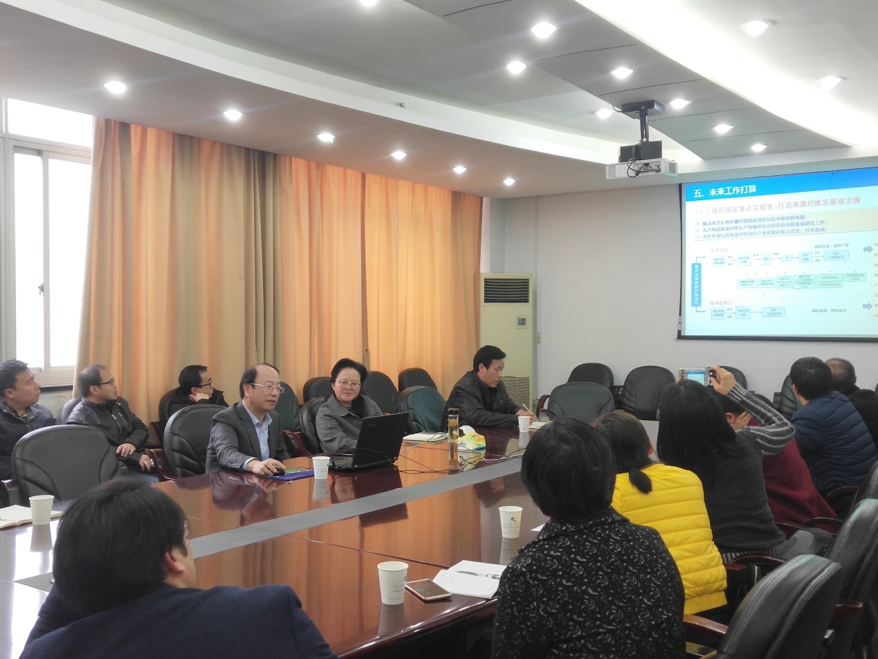 指导会前,副校长寿永明与夏延致教授就高校科研平台建设及科研合作等方面进行了亲切交流。指导会上,夏延致结合自己科研工作经历,介绍了自己领衔科研团队三十多年如一日地潜心研究“阻燃纤维及阻燃粘胶纤维”等内容的基础上,通过实践凝炼出科研主攻方向——海洋生物质纤维研究,取得了一系列丰硕成果,包括获得国家杰出青年项目、国家科技进步二等奖等。难能可贵的是夏延致科研团队重视海藻纤维的基础理论研究与其产业化及成果转化研究并重,创建了海藻纤维研究领域的“基础研究—应用基础研究—产业化”的一条龙式科研模式,具有十分重要的创新意义与应用推广价值。他重点论述了有关国家重点实验室与省级协同创新中心的运行机制、组织架构、建设经验以及未来的研究工作方向。夏延致强调指出,在申报建设各级科研平台时,要注重积累平台基础、平台团队建设、命名好平台名称、确定研究方向以及建设目标定位等。会上,夏延致针对科研人员提出的问题,进行了解答和交流。与会科研人员纷纷表示,听了夏延致的指导报告后获益良多,有助于促进我校今后的科研平台建设管理工作。