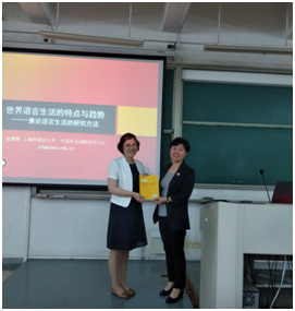 讲座之后,赵蓉晖将她主编的《世界语言生活状况报告》赠送给外国语学院,外国语学院院长钟莉莉教授代表学院接受了赠书。