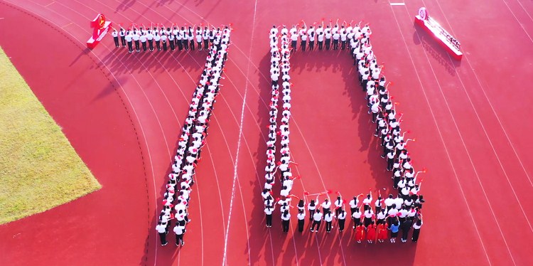 7时30分,郝敬习宣布仪式正式开始,伴随着《歌唱祖国》悠扬的旋律,国旗护卫队以整齐划一、铿锵有力的步伐正步而出,依次穿过由全院及建行党员、预备党员、学生代表组成的“70”字样方阵,气势恢宏地走到升旗台前,庄严的升国旗仪式正式拉开帷幕。元培学院合唱团领唱《义勇军进行曲》,五星红旗迎风飘扬,舒展在蔚蓝的天空,随着雄壮的国歌声冉冉升起。在场的全体师生员工身着统一正装,整齐列队、齐声高歌,挥舞着手中的国旗,用饱满的热情、昂扬的斗志表达了对伟大祖国的衷心爱戴和真诚歌颂。