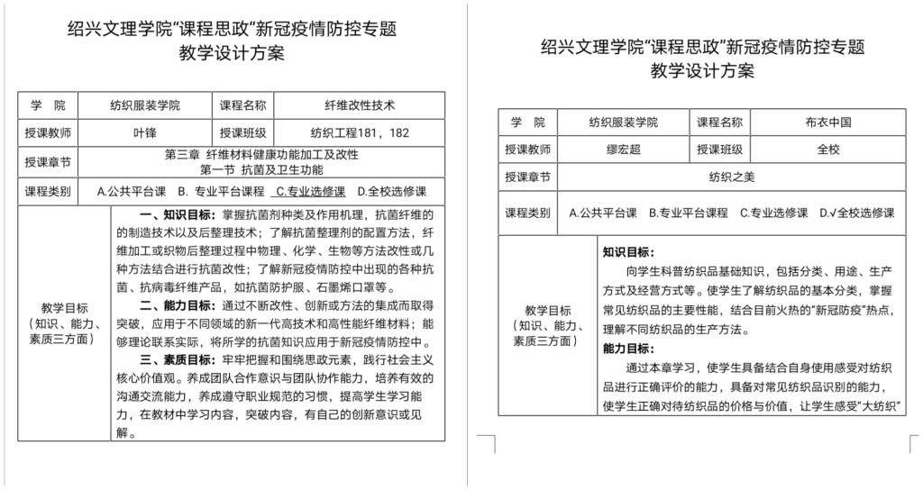 与此同时,学院教师党员也在积极践行自己的承诺。在积极开展网络教学,保障“停课不停教,停课不停学”的同时,党员教师不断创新线上教学模式,将“课程思政”融入教学,做到“停课不停育”。我院叶锋、缪宏超两位老师分别结合《纤维改性技术》和《布衣中国》的课程教学,引用新冠疫情防控中的典型案列,融入专业内容,在较短的时间内精心设计出教学方案。被学校选编作为“课程思政”新冠疫情防控专题教学设计示范方案,起到示范引领作用。