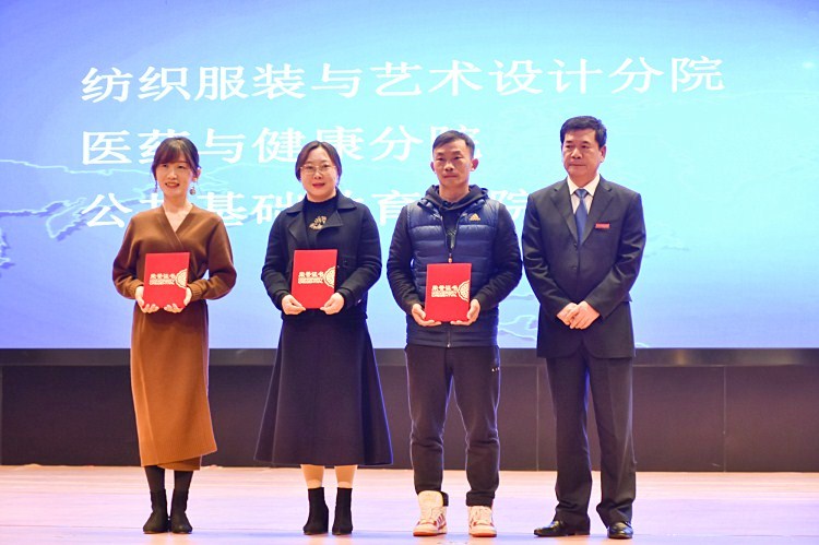 叶访春为学院第五届教坛新秀奖获得者(左起李睿、杜轶君、王军伟)颁奖