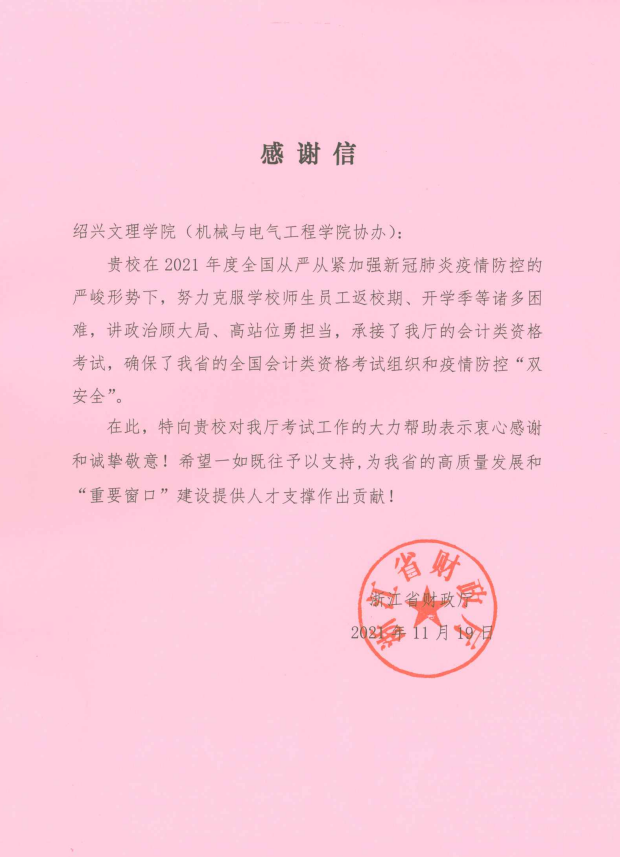 近日,浙江省财政厅发来感谢信,对我校(机械与电气工程学院协办)全力支持2021年度全国会计类资格考试表示感谢。