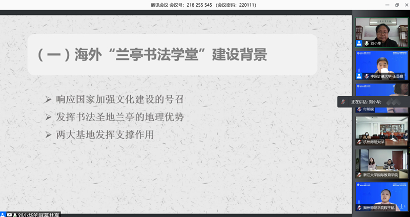 1月13日上午,为推进我省国际中文教育工作,由浙江省教育厅国际合作与交流处举办的2021年度浙江省国际中文教育工作会议在线上召开,全省二十余所高校的职能部门负责人、汉语国际教育专业负责人等出席会议。我校兰亭书法艺术学院相关负责人做主题发言,外事处及国际教育学院主要负责人及相关教师出席会议。