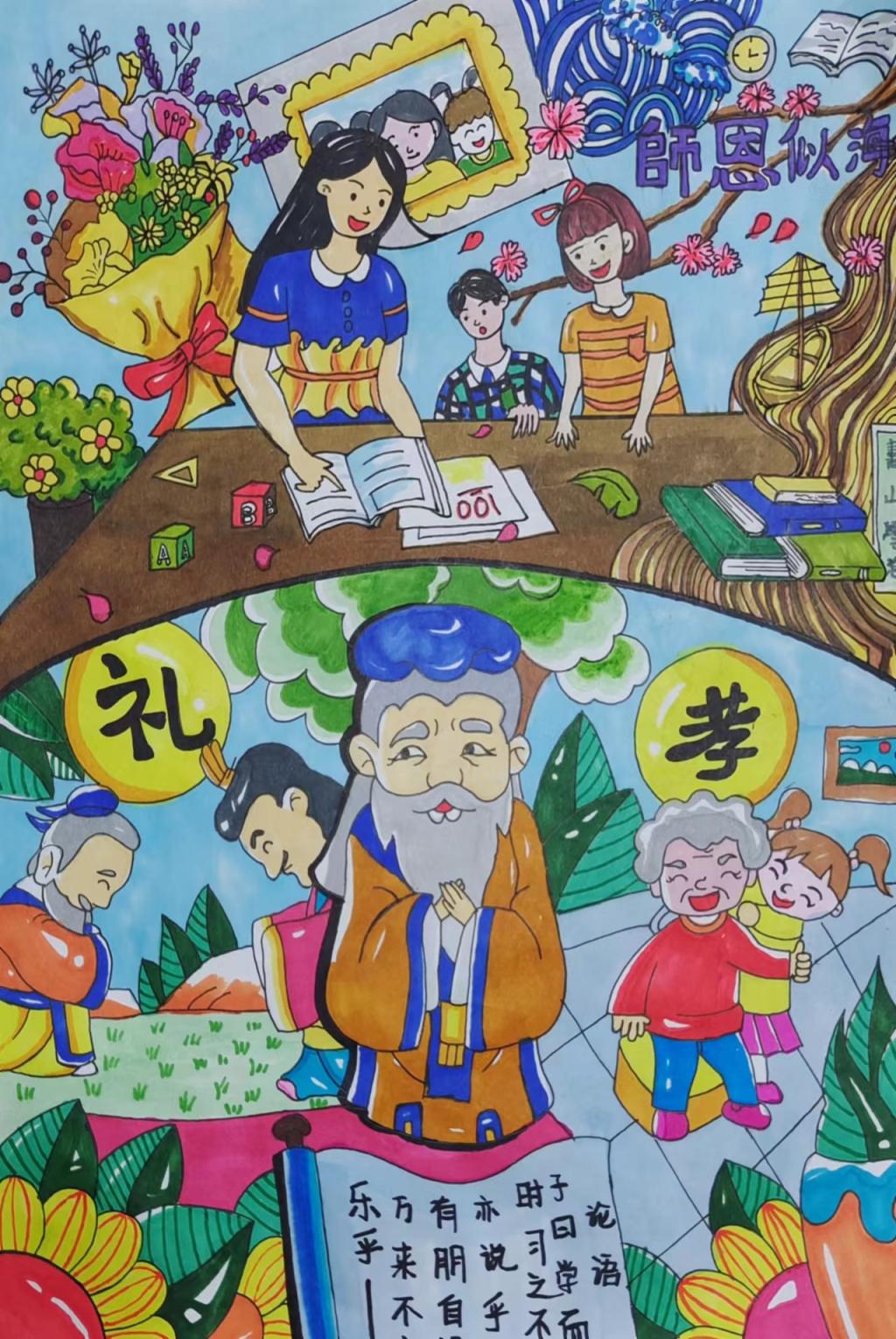 一张张精美的海报、剪纸、贺卡,以丰富的表现形式呈现出中国底蕴深厚的教育文化和杰出人物,展现了师范生技能与师德师风。