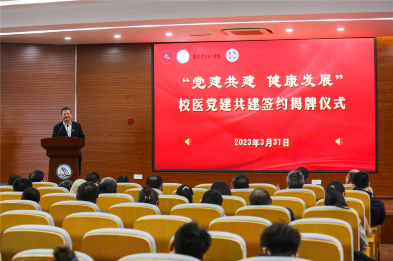 为深入贯彻落实党的二十大精神,积极推进党建“四个融合”,有效发挥学校和医院专业资源的互补优势,3月31日下午,“党建共建,健康发展”校医党建共建签约揭牌仪式在校国家重点实验室岩石力学与地质灾害实验中心大楼举行。校党委副书记、校工会主席沈赤,人事处处长黄曼,校工会常务副主席章欢平,附属医院党委书记夏瑞明等参加会议。会议由校机关党委书记、组织部副部长于响生主持。校医党建共建单位领导、党支部书记、教授代表、党建共建工作联络员、师生健康保健总协调员、健康保健专家等参加签约揭牌仪式。