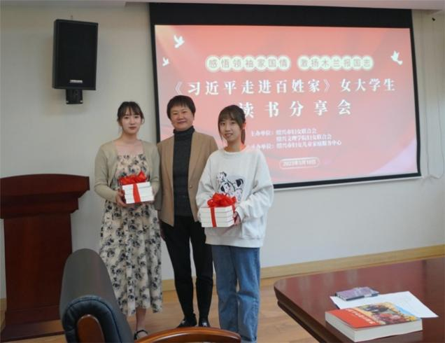 周琦向女大学生代表赠送《习近平走进百姓家》书籍,勉励女大学生感悟领袖为民情怀、凝聚巾帼奋进力量。