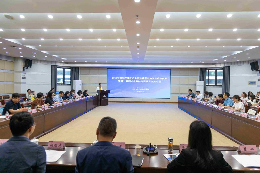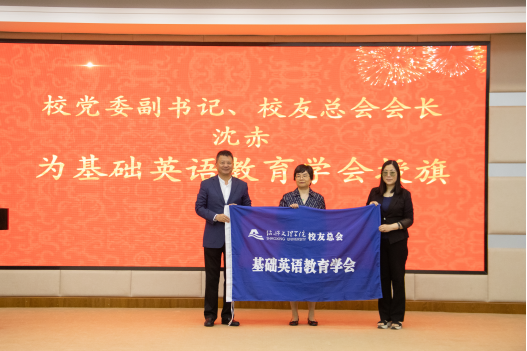 沈赤为基础英语教育学会授旗。沈赤对基础英语教育学会的成立表示祝贺,对校友、老师的积极参与以及绍兴市教育局的支持和指导表示感谢。他指出,学校在“两横两纵”校友工作架构中既为校友提供服务,也为教学提供指导。他希望学会的成立能够为绍兴市基础英语教育搭建相互交流、相互促进的平台,为学校建设指明方向、准确定位,为基础英语教育奠定良好的基础。他对学会发展提出四点要求:一是要建设好,在今后工作中建章立制、加强管理和服务;二是要活动好,做好交流、指导等各项活动,发挥凝聚各方面力量和智慧的桥梁纽带作用;三是要服务好,在服务学会成员和单位中发挥积极作用,全面提升学会工作;四要发展好,进一步推动学会高质量发展,在发展过程中实现合作共赢。