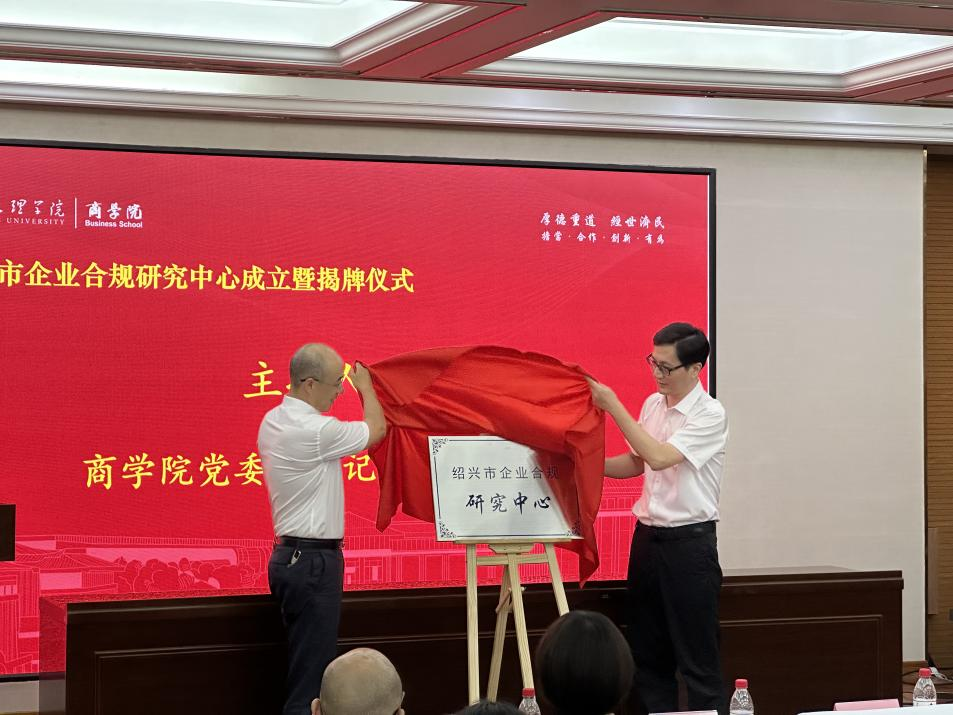 商学院院长、市企业合规研究中心主任王华锋和绍兴市司法局副局长宋亮共同为铜匾揭牌。