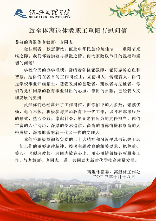 重阳节到来之际,离退休党委、离退休工作处发出“致全体离退休教职工重阳节慰问信”,信中表达了对老教师、老同志的崇敬之情和慰问之意。