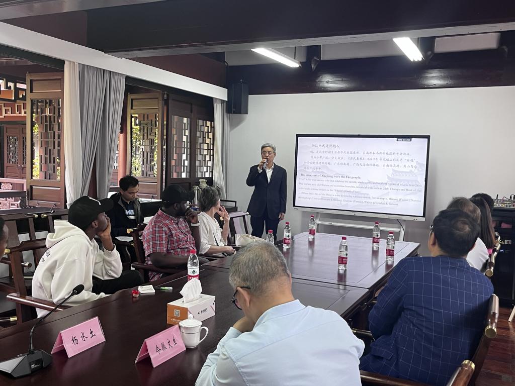 仪式后,冯建荣为师生们介绍绍兴文化,从越地由来到绍兴茶文化,从黄酒酿造技艺到越窑青瓷制作历史,留学生们仔细聆听,热情提问。