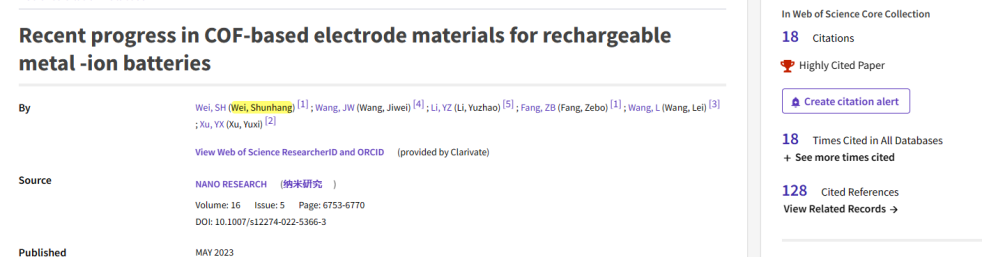 此外,位顺航博士在《Nano Research》上发表的题为“Recent progress in COF-based electrode materials for rechargeable metal -ion batteries”的文章成为高被引论文。
