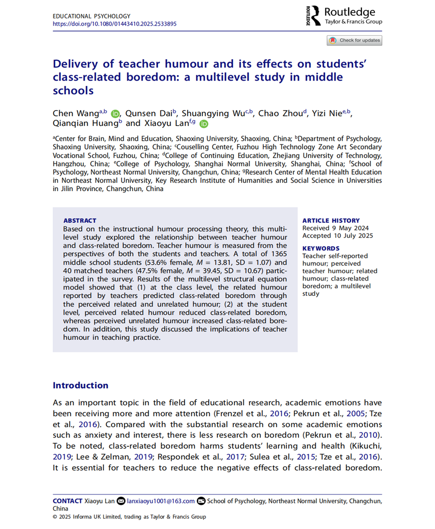 近日,久久精品一区二区|久久久一区二区三区|欧美日韩视频|欧美福利视频|高清欧美性猛交xxxx黑人猛交|久久久www成人免费精品|在线观看成人网站大脑、心智与教育研究中心、教育与心理学院心理学系王臣副教授在国际心理学权威期刊Educational Psychology(SSCI收录,JCR Q1,中科院二区,IF=2.57)发表题为Delivery of teacher humour and its effects on students’class-related boredom: a multilevel study in middle schools的学术成果该研究揭示了教师幽默表达与学生课堂无聊之间的复杂关系。